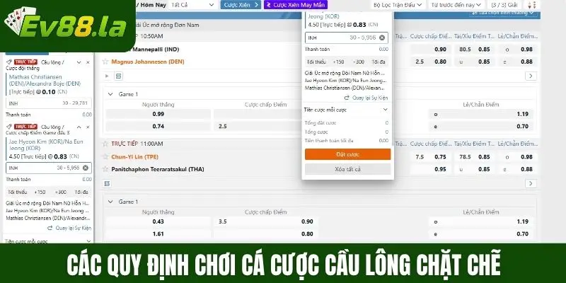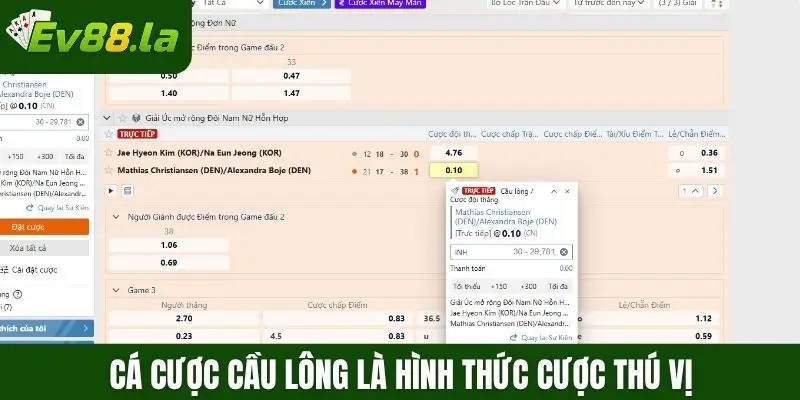 Cá cược cầu lông hiện đang được nhiều người quan tâm và trải nghiệm. Đây là hình thức giải trí trực tuyến do nhà cái uy tín Ev88 com cung cấp. Điểm hấp dẫn là người chơi có cơ hội nhận các mức thưởng cao và tiếp cận nhiều kèo cược độc đáo.
