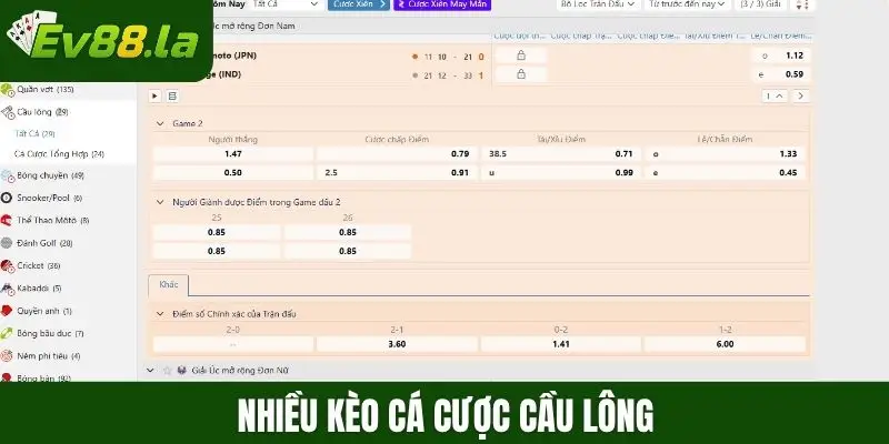 Cầu lông ngày càng phổ biến và xuất hiện tại nhiều giải đấu quốc tế. Nhờ lượng fan hâm mộ đông đảo, các trận đấu trực tuyến được phát sóng liên tục. Người chơi có thể đặt cược bất kỳ lúc nào và yên tâm về tính minh bạch cũng như an toàn tại Ev88.