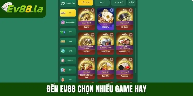 Ev88 sở hữu danh mục game bài 3D phong phú, đa dạng thể loại, phù hợp mọi sở thích. Các tựa game được thiết kế chân thực, sinh động, giúp trải nghiệm thêm phần kịch tính và thú vị. Một số game bài nổi bật gồm: